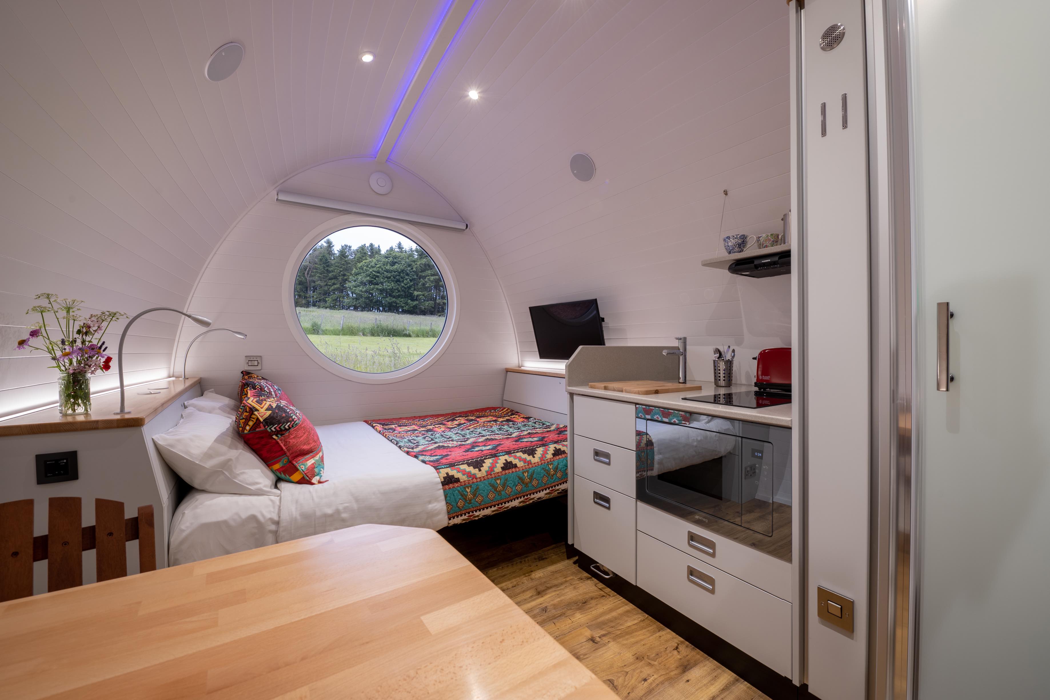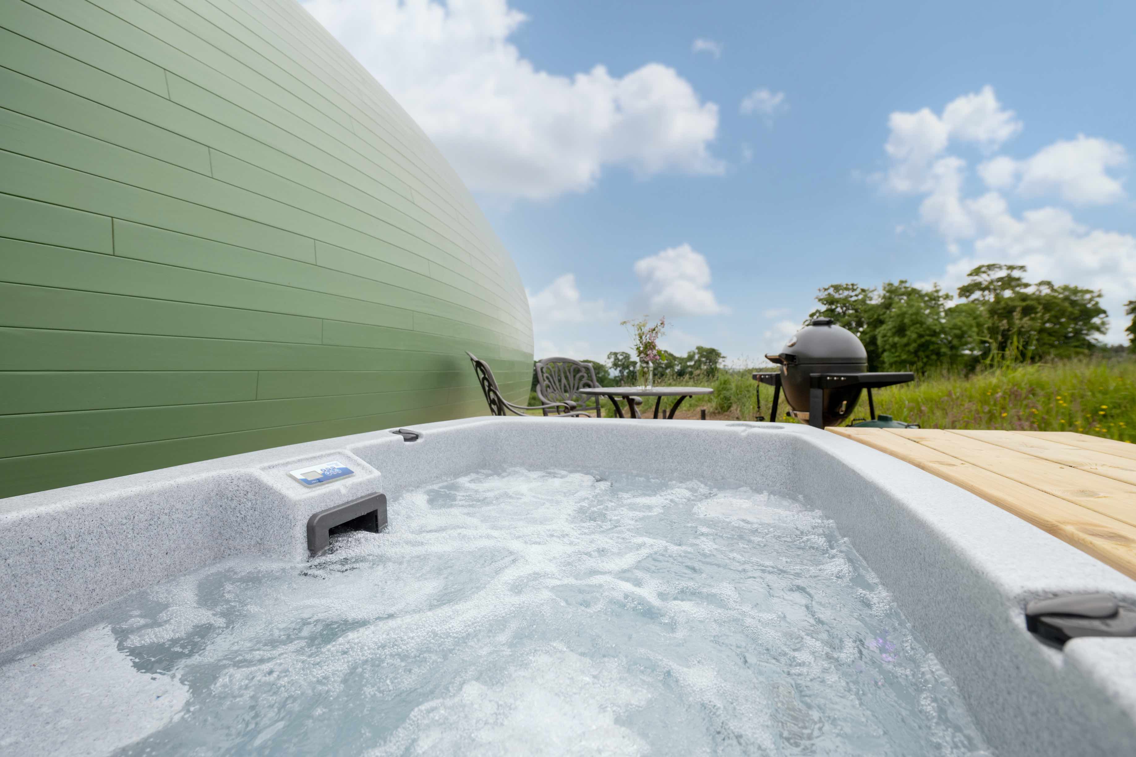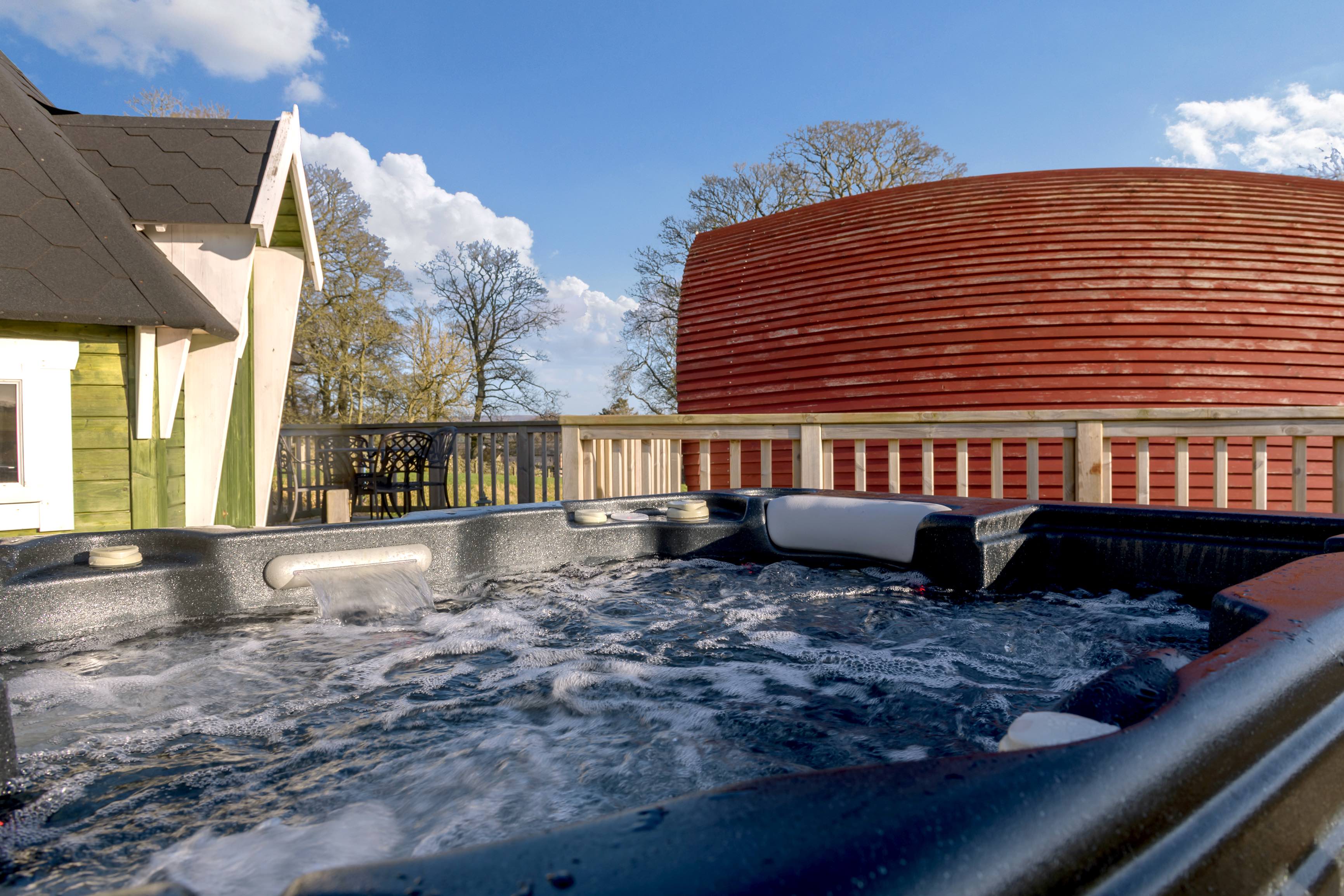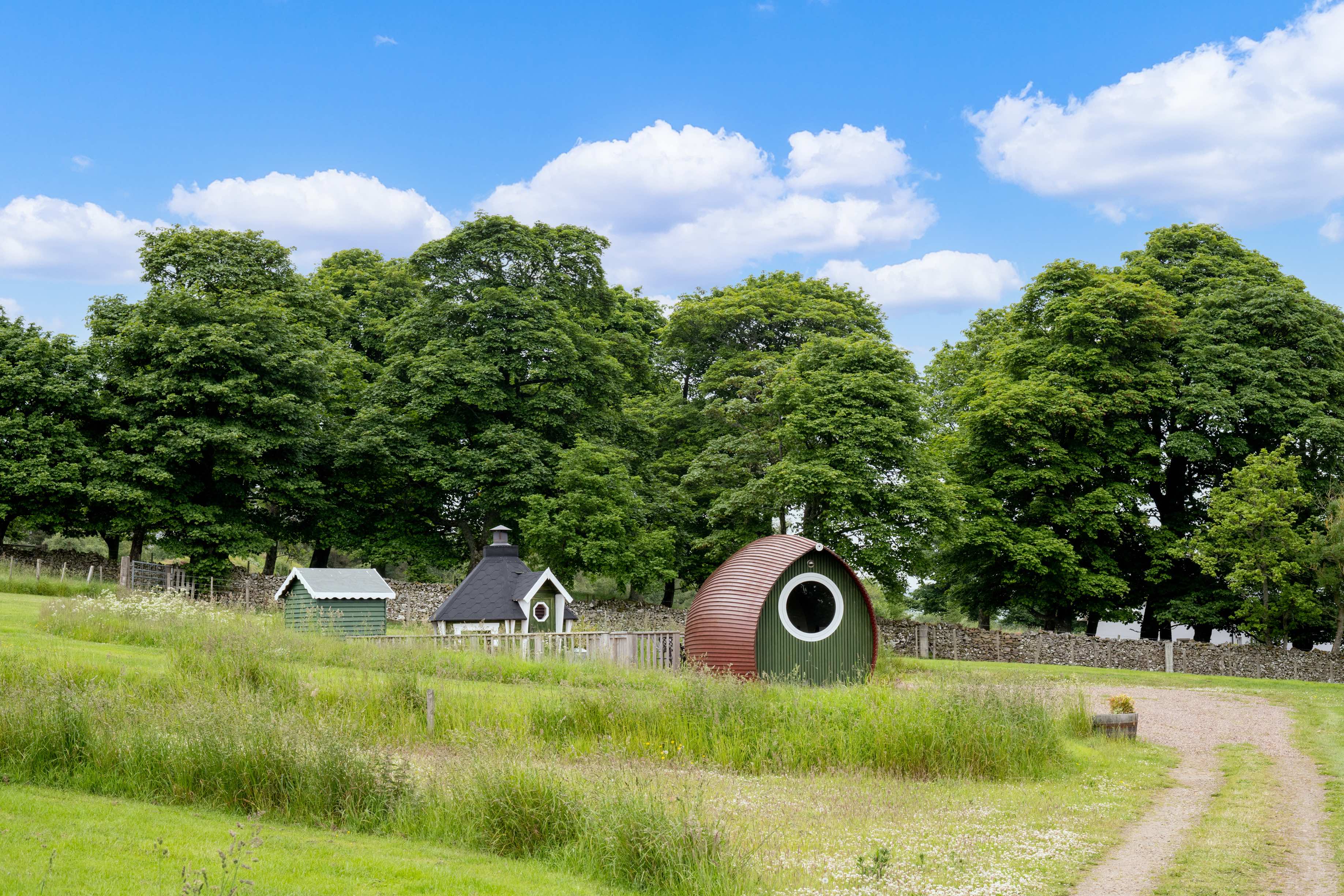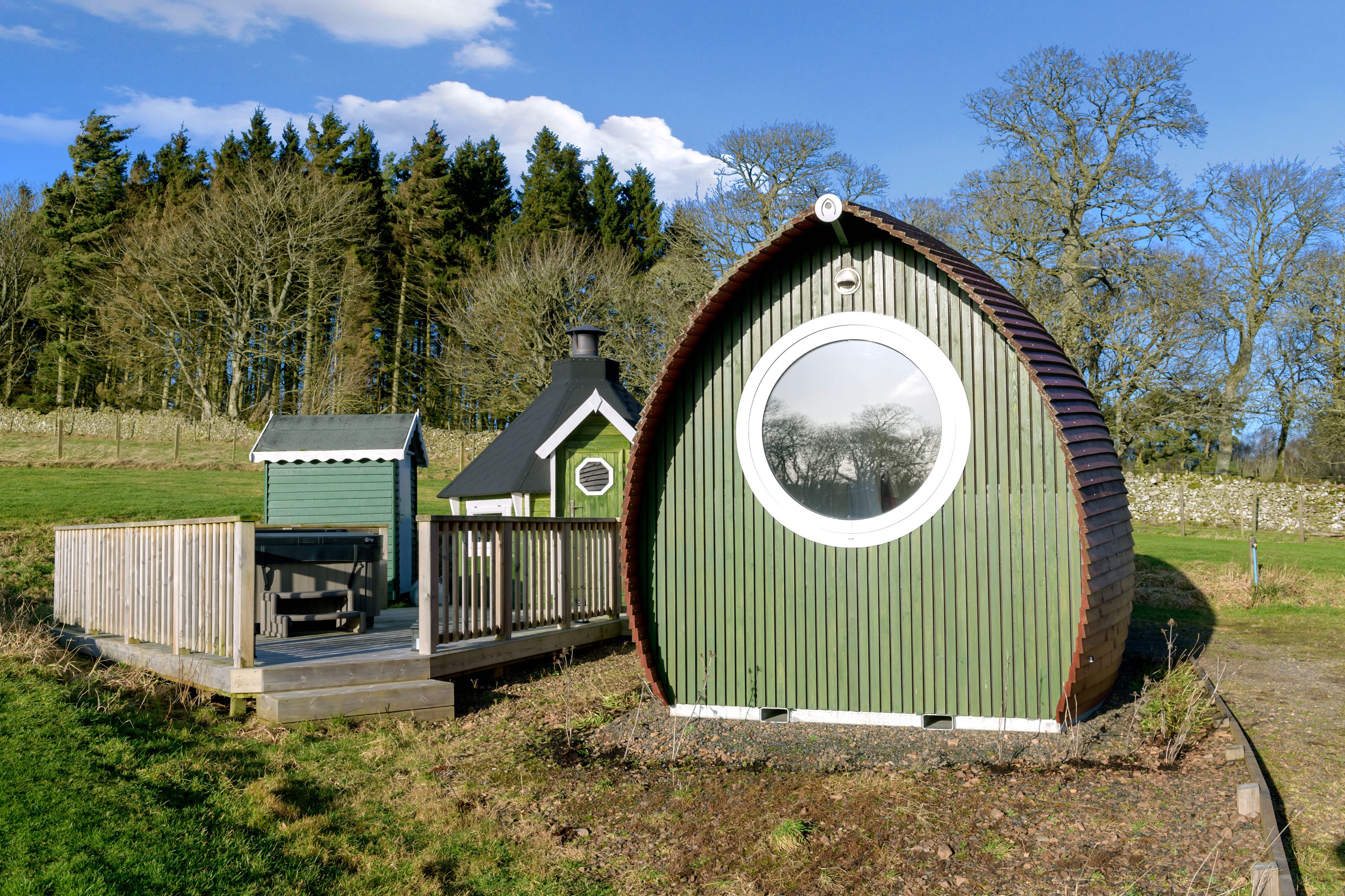 Gorgeous Glamping Pods,with private hot tubs, set on an organic working farm in the hills of the Scottish Borders. Stunning views, amazing space and peace.